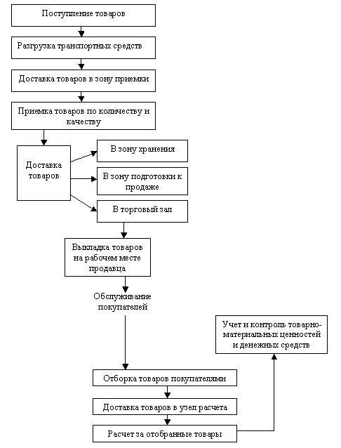 Технологический процесс включает в себя совокупность последовательно взаимосвязанных способов, приемов и трудовых операций, направленных на сохранение потребительских свойств товаров и ускорения доведения товаров до торговой сети и потребителей. Технологический процесс обеспечивает обработку потоков, начиная с поступления товаров в магазин и кончая полной подготовкой их к продаже. Технологический процесс включает такие операции, как приемка товаров по количеству и качеству, хранение, фасовка и упаковка товаров, их перемещение и выкладка в торговых залах и др.