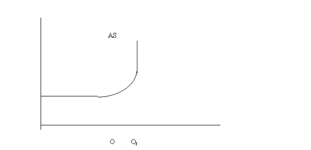 . На рис 4 Qf позначає потенційний рівень реального об'єму національного виробництва при повній зайнятості. При цьому об'ємі національного продукту виникає природний рівень безробіття. Горизонтальний відрізок кривої сукупної пропозиції включає реальний об'єм національного виробництва, який значно менше ніж об'єм національного виробництва при повній зайнятості, Qf. Отже, горизонтальний відрізок свідчить про те, що економіка знаходиться в стані глибокого спаду, або депресії, і що не використовується велика кількість машин, устаткування і робочої сили. Ці невживані ресурси, як трудові, так і матеріальні, можна привести в дію і при цьому не надати або майже не чинити ніякого тиску на рівень цін. Коли на цьому відрізку об'єм національного продукту починає збільшуватися, то ні дефіцит, ні вузькі місця у виробництві, можуть сприяти підвищенню цін, не виникають. Оскільки виробники можуть придбати трудові і інші ресурси за твердими цінами, виробничі витрати при розширенні виробництва не зростуть, а, отже, не буде підстав для підвищення цін на товари. І навпаки, цей відрізок також припускає, що якщо реальний об'єм виробництва скоротиться, то ціни на товари і ресурси залишаться на тому ж рівні. Це значить, що реальний об'єм виробництва зменшиться, але ціни на товари і заробітна платня залишаться незмінними.