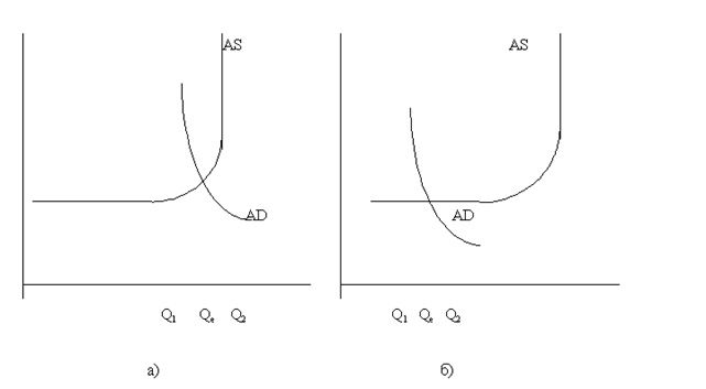 На малюнку 6б крива сукупного попиту перетинає криву сукупної пропозиції на кейнсіансбкому відрізку, тобто там, де крива розташована горизонтально. В цьому конкретному випадку рівень цін не грає ніякої ролі в утворенні рівноважного реального об'єму національного виробництва. Якби промисловий сектор провів більший проблем національного продукту, Q2, його не можна було б продати. Сукупного попиту не вистачило б, щоб скуповувати на ринку весь національний продукт. Зіткнувшися з небажаними запасами товарів, підприємства скоротили б виробництво до рівноважного рівня Qe, і навпаки, якби фірми проводили об'єм національного виробництва, позначений Q1, їх запаси швидко б зменшилися, тому що об'єм продажів був би більше об'єму виробництва. Тому фірми розширили б виробництво, і об'єм національного продукту збільшився.