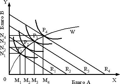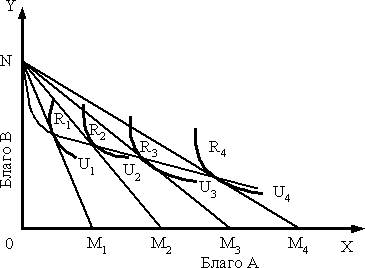 Она показывает, как потребительский набор, состоящий из товаров Х и расходов на другие товары, изменяется в зависимости от дохода. Эта кривая также в зависимости от видов благ имеет разный наклон.
