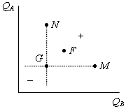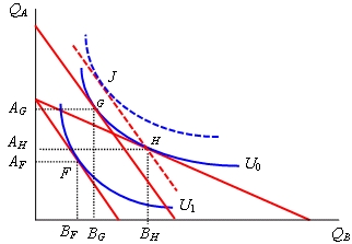 . В этом случае потребитель заменяет часть подорожавшего блага определенным количеством относительно подешевевшего. Но поскольку точка G