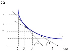 так как в точке касания кривой безразличия с бюджетной линией наклон первой (MRSB,A