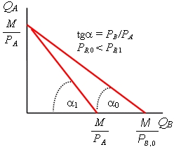 , все точки которой представляют доступные потребителю при данном бюджете комбинации двух благ. Из выражения (3.11) служит, что бюджетная линия имеет отрицательный наклон; угол ее наклона определяется соотношением цен, а отдаленность от начала координат - величиной бюджета. Если при фиксированном бюджете и неизменной цене блага А
