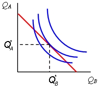 Если каждый вид товара продается по единой для всех цене, то в соответствии с условием (3.12) в состоянии равновесия предельная норма замещения любой пары благ у всех потребителей будет одинаковой независимо от индивидуальных предпочтений и бюджетов.