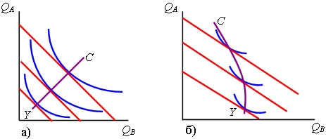 . Смещение более низких кривых безразличия к оси абсцисс отражает увеличивающееся предпочтение некачественного блага по мере снижения благосостояния потребителя.