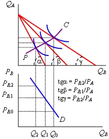 Это показывает рис. 3.10 (верхняя часть. Все точки касания поворачивающейся бюджетной линии с кривыми безразличия образуют линию «цена-потребление»