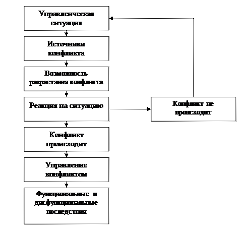Рисунок 3 представляет модель конфликта как процесса. Из нее видно, что существование одного или более источников конфликта увеличивает возможность возникновения конфликтной ситуации в процессе управления. Однако, даже и при большей возможности возникновения конфликта, стороны могут не захотеть реагировать так, чтобы и дальше усугублять ситуацию. Одна группа исследователей обнаружила, что люди не всегда реагируют на конфликтные ситуации, которые влекут за собой малые потери или которые они считают малоопасными. Другими словами, иногда люди понимают, что потенциальные выгоды участия в конфликте не стоят затрат. Их отношение к этой ситуации выражается следующим: «На этот раз я разрешу ему поступить по-своему».