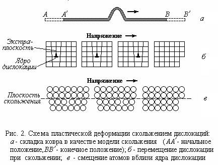 ) дислокаций. Гипотеза об участии дислокаций в пластической деформации кристаллов была выдвинута в середине 30-х годов и лишь через 15-20 лет (после создания трансмиссионного электронного микроскопа) подтверждена экспериментально. Механизм пластической деформации, основанный на скольжении дислокаций, может быть сопоставлен с перемещением по полу ковра, на котором специально сделана складка (рис.2).