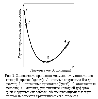 Действительно, экспериментально определенные значения прочности металлических «усов» (монокристаллические нити, практически не содержащие дефектов кристаллического строения) близки к расчетным. Однако прочность реальных металлов в сотни и тысячи раз меньше. Такое различие теоретической и экспериментально определяемой прочности металлов объясняется несовершенством их кристаллического строения. При наличии множества дислокаций сдвиг одной части кристалла относительно другой не сопровождается разрывом межатомных связей, а происходит путем движения (скольжения