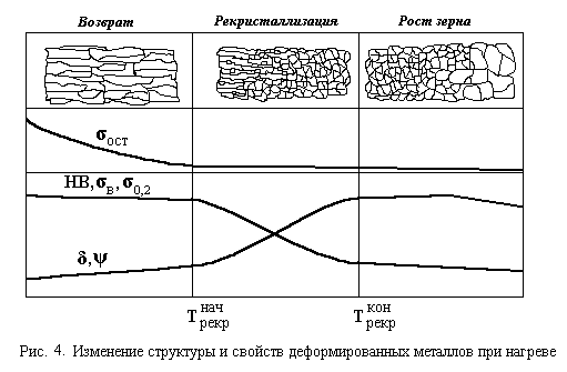 , который заключается в нагреве до температуры выше температуры рекристаллизации, выдержке при этой температуре и последующем охлаждении. При нагреве металла атомы приобретают повышенную подвижность, уменьшается плотность дефектов кристаллического строения, снимаются внутренние напряжения, образуются новые равноосные зерна. Это приводит к уменьшению твердости и прочности и к увеличению пластичности (рис. 4).Изменения в структуре и свойствах металла зависят от температуры нагрева. Можно выделить три основных этапа.