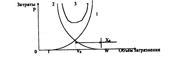 Суммарные экологические издержки, связанные с функционированием предприятия, как отмечалось выше, определяются суммой ущерба и природоохранных затрат. Их зависимость от объеме выбросов показана на рис. 16.2 - кривой 3.