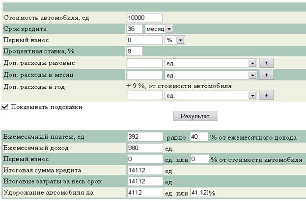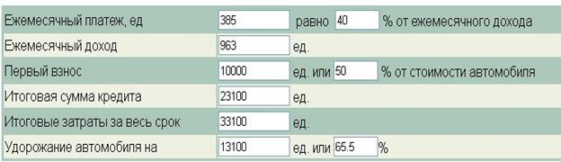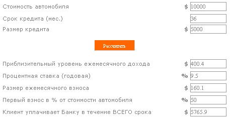 Банк неизменно выдвигает весьма жесткие условия к претенденту на получение кредита, среди которых многим самыми жесткими кажутся ограничения возрастные: банк откажет кредитовать вашу покупку, если вы не дожили до 21 года или уже пережили 51. А также если ваш водительский стаж не превышает полугода. Однако большинству претендентов на кредит кажутся достаточно оправданными другие требования – по уровню доходов. В соответствии с ними ежемесячные платежи по кредиту с учетом страховых выплат не должны превышать 30-50 процентов месячного дохода. Если вы одинокий человек и берете целевой кредит на два года для покупки, например, российского автомобиля средней стоимостью 4200 долларов США, то ваш ежемесячный платеж по кредиту составит примерно 145 долларов. А это значит, что для его получения Вы должны зарабатывать не менее 300 долларов в месяц. Если же Вы семейный человек, то банк в обязательном порядке подсчитает средний доход на каждого члена семьи и будет ориентироваться именно на эту цифру.