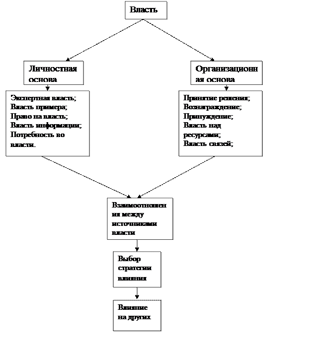 Власть – это необходимый элемент организации эффективной работы предприятия. Для успешного управления производством менеджер должен обладать соответствующими властными полномочиями. Оказывая влияние на своих подчиненных, менеджер должен обеспечить мобилизацию коллектива на выполнение стоящих перед предприятием задач. Власть как процесс базируется на двух началах: личном и организационном. В том и другом случаях используются различные источники власти или средства ее реализации. Умелое использование имеющихся у руководителя источников власти лежит в основе другого организационного процесса – лидерства.