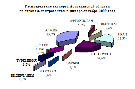 В 2008 г. ведущими астраханскими экспортерами являлись:ООО "Астраханьгазпром"; ОАО "ССРЗ им.III Интернационала";ОАО "ССЗ "Красные Баррикады"; ООО "Электротехническая компания"; ООО "Вафа". Основными импортерами являлись:ОАО "ССЗ "Лотос"; ООО Судоходная компания "Астронавт"; ООО "Астраханьгазпром"; многопрофильная фирма "Иран-Росторг"; ОАО СП "Астраханский корабел"; ОАО "ССЗ "Красные Баррикады". Предприятия и фирмы Астраханской области поддерживают внешнеэкономические связи с 59 странами мира. Наиболее тесно Астраханская область сотрудничает с Ираном, Казахстаном, Туркменией, Германией, Украиной, Азербайджаном, Индией, Италией, Литвой, Нидерландами, Узбекистаном.