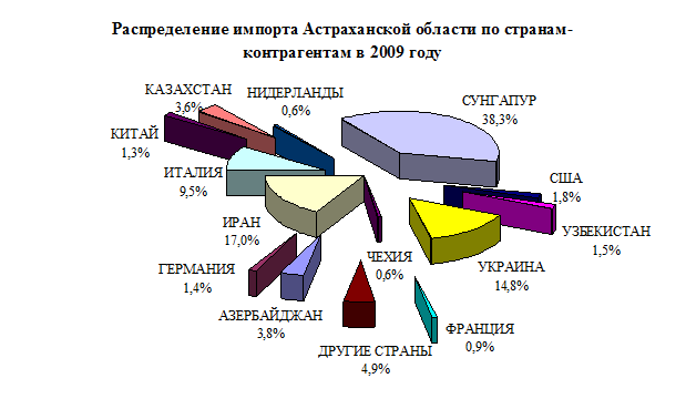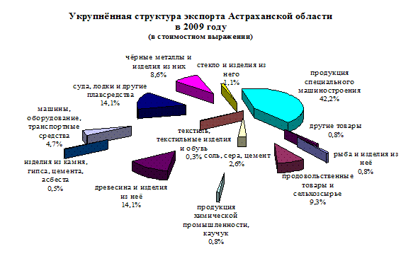 Астраханская область поставляет на экспорт в основном свои природные ресурсы: газ, серу, соль и рыбную продукцию, а также изделия из гипса, оборудование, суда, древесину и т.д. Структура импорта разнообразна. Импортируются черные металлы; приборы и аппараты оптические; электрооборудование, электромашины; оборудование; изделия из черных металлов.