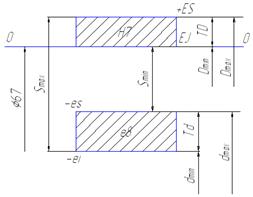 Задана посадка Ø67 H7/e8. Предельное отклонение отверстия Ø67 H7: верхнее ES=30мкм; нижнее EJ=0мкм. Предельное отклонение вала: верхнее es=-66мкм; нижнее ei=-106мкм.