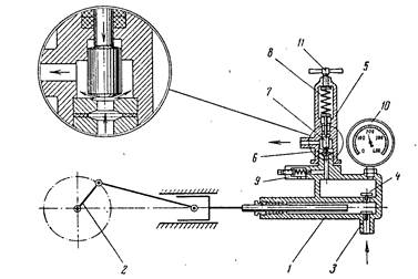 Молоко при ходе плунжера влево проходит через всасывающий клапан 3 в цилиндр, а при ходе плунжера вправо проталкивается через клапан 4 в нагнетательную камеру, на которой установлена манометрическая головка 10 для контроля давления. Она имеет дросселирующее устройство, дающее возможность эффективно уменьшить амплитуду колебания стрелки манометра. Далее молоко по каналу поступает в головку 5, в которой поднимает клапан 7, прижимаемый к седлу 6 пружиной 8. Натяжение пружины регулируется винтом 11. Клапан и седло притерты друг к другу. В нерабочем положении клапан плотно прижат к седлу пружиной 8, которая сжата регулировочным винтом 11, а в рабочем, когда нагнетается жидкость, клапан приподнят давлением жидкости и находится в «плавающем» состоянии.