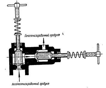 Жидкий продукт в головку может нагнетаться любым насосом, обладающим равномерной подачей и способным создать высокое давление. Для этой цели применимы многоплунжерные, роторные и винтовые насосы. Наибольшее распространение нашли гомогенизаторы высокого давления с трехплунжерными насосами. Схема устройства плунжерного гомогенизатора клапанного типа показана на рис. 2.