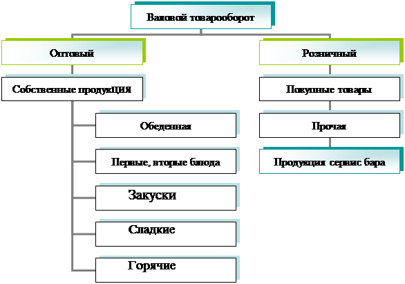 Товарооборот общественного питания выражает экономически отношения, возникающие при реализации собственной продукции, покупных товаров, оказании услуг по организации питания и состоит из двух основных частей:
