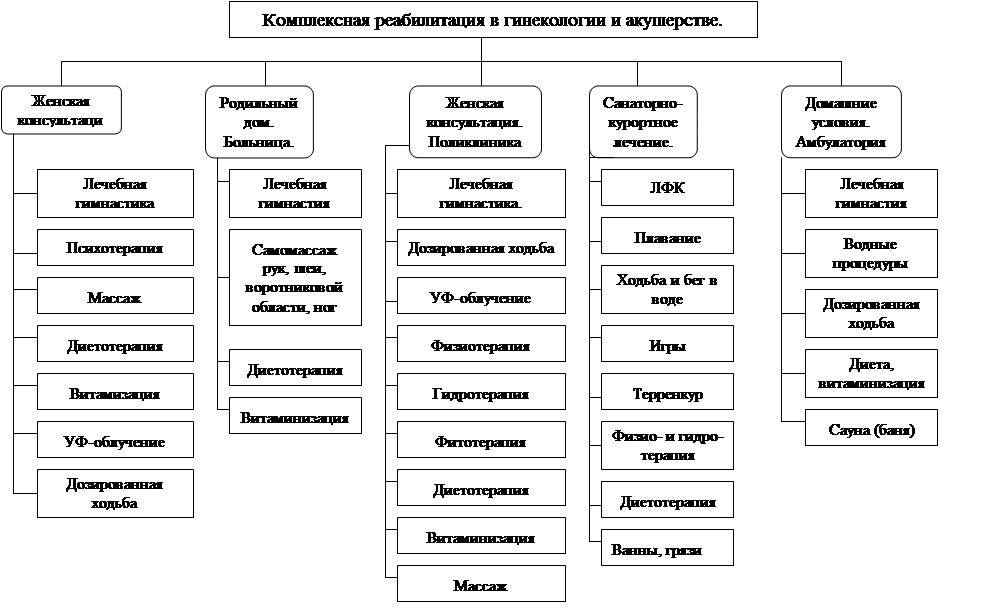В комплекс реабилитационных мер входят физио- и гидро-процедуры, ЛФК, массаж, санаторно-курортное лечение и др. (схема 1).