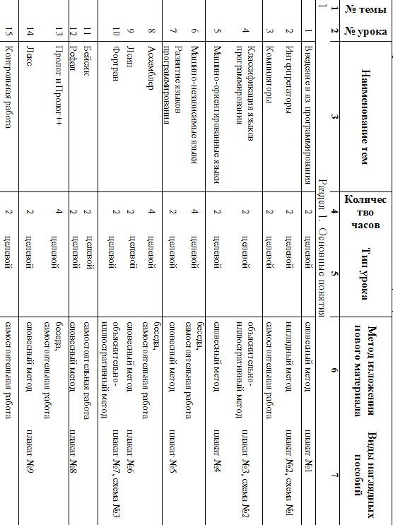 Из учебного плана видно, что на предмет "Языки программирования" всего отводится 171 час. Из них 82 – теоретических, 60 – практических, 13 часов отводится на лабораторные занятия и 30 часов отведено на курсовой проект. Минимальное количество контрольных работ составляет 5 работ. Есть зачет. Курсовой проект сдается в 7 семестре. Экзамен проводится в 7 семестре. Предмет "Языки программирования" изучается на 3 – 4 курсе. В 5семестре обучения 14 недель, в неделю по 2 часа: 14*2=28 часов. В 6 семестре обучения 12 недель, в неделю по 4 часа: 12*4=48 часов. В 7 семестре обучения 7 недель, в неделю по 14 часов: 7*14=98 часов. Всего 172 часа. Предмет полностью изучается на 4 курсе в 7 семестре.