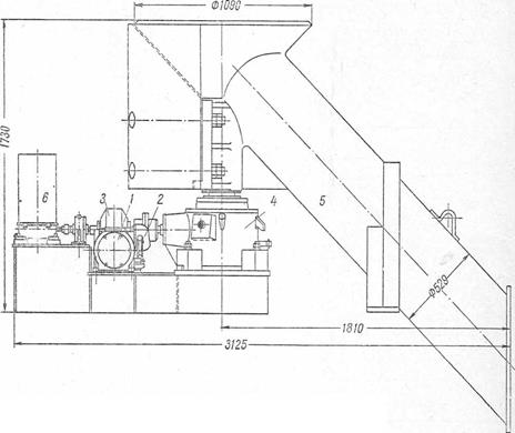 приемной воронкой. Привод механизма поворота состоит из электродвигателя 1 типа АР-42-8 (.V = 0,85 кет, п = 650 об/мин), редукторов червячного 3 и конического 4 и тормоза 2. Скорость поворота 2,8 об/мин. Крайние положения течки фиксируются командо-аппаратом 6.