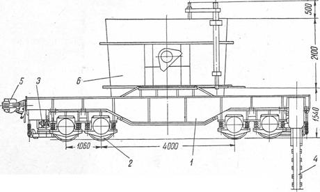 Рис. 20-11. Сталевозная тележка:1-рама;2-колесная пара с буксами;3-механизм передвижения;4-токосъемное устройство;5-автосцепка;6-сталеразливочный ковш.
