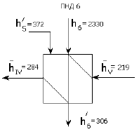 | ПВД 1 | ПВД 2 | ПВД 3 | ДЕАЭРАТОР | ПНД 4 | ПНД 5 | ПНД 6 | ПНД 7 | | Т-ра на входе | t | 300 | 152 | 104 | 95 | 80 | 65 | 50 | 35 | | т-ра на выходе | t | 248 | 200 | 152 | 104 | 95 | 80 | 65 | 50 | | Энтальпия воды на входе | h | 875 | 665 | 455 | 416 | 350 | 284 | 219 | 153 | | Энтальпия воды на входе | h | 1085 | 875 | 665 | 455 | 416 | 350 | 284 | 219 | | Т-ра конденсата гр. пара | t | 255 | 207 | 159 | 104 | 100 | 85 | 70 | 55 | | Энтальпия конденсата гр. пара | h | 1116 | 906 | 696 | 455 | 438 | 372 | 306 | 241 | | Давление отбора пара | P | 4,33 | 1,8 | 0,603 | 0,603 | 0,101 | 0,0578 | 0,0312 | 0,0157 | | Энтальпия отбора пара | h | 3073 | 2894 | 2726 | 2726 | 2480 | 2410 | 2330 | 2260 |