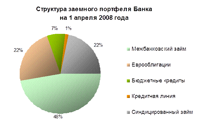 Объем обязательств по привлеченным Банком займам по состоянию на 1 апреля 2008 года эквивалентен 1 564,7 млн. долларов США. В структуре заемного портфеля значительная доля приходится на межбанковские займы (48%), доля еврооблигаций м синдицированных займов составляет по 22%.