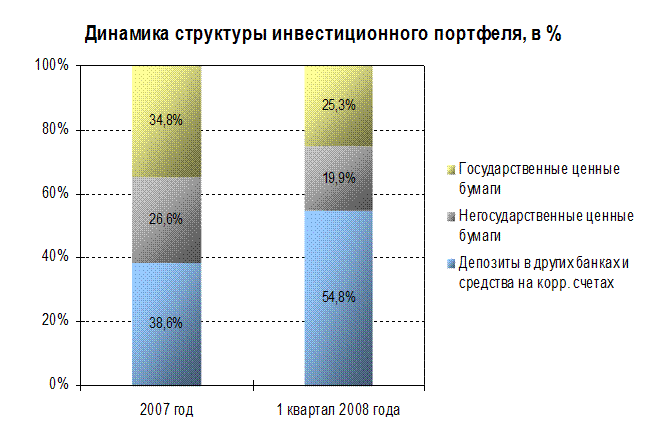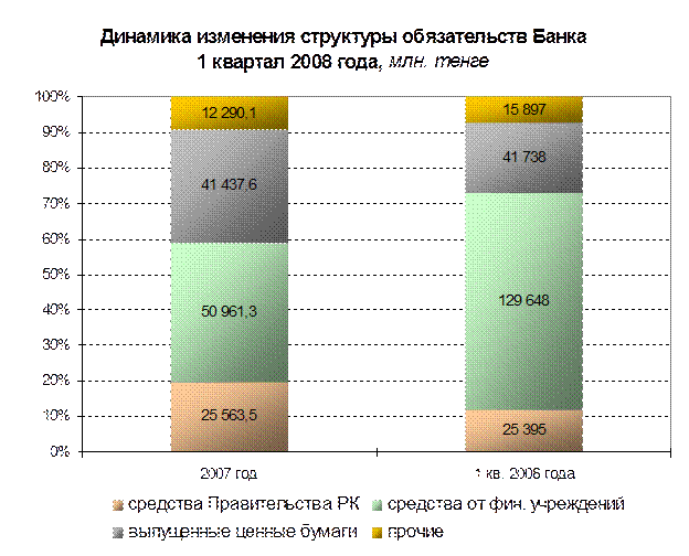Изменение структуры обязательств Банка на конец первого квартала 2008 года в большей степени связано с привлечением Банком заемных средств, увеличением обязательств, отраженных в категории «Прочие обязательства».
