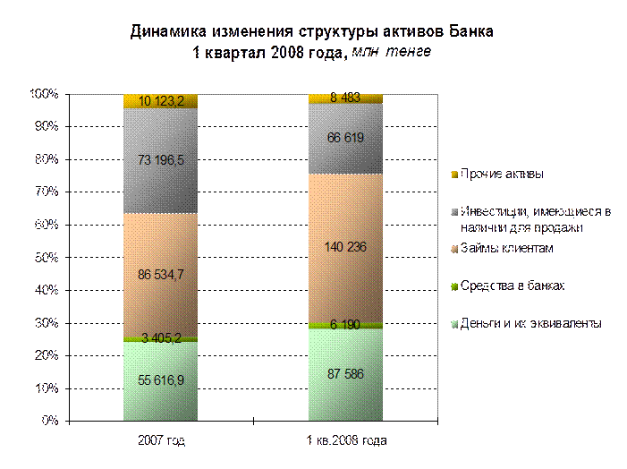 С начала текущего 2008 года объем активов Банка увеличился на 35%, достигнув на 1 апреля 2008 года 309,6 млрд. тенге.