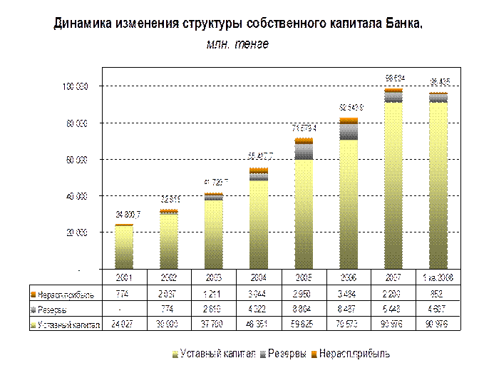Собственный капитал Банка по итогам 1 квартала 2008 года составил 96,4 млрд. тенге, снизившись с начала года на 2,2 млрд. тенге или на 2%. Это было вызвано снижением доли резервного капитала за счет увеличения резервов от прочей переоценки.