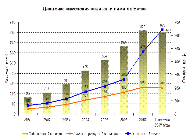 Так, при существующем объеме капитализации лимит кредитования Банком отраслей по состоянию на 31 марта 2008 года составил 644 млн. долларов США, региональный лимит достиг размера 240 млн. долларов США, лимит на отдельно взятого заемщика составил 200 млн. долларов США (рис.14).