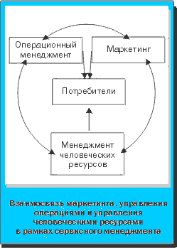 Рассмотрение общей проблематики сервисного менеджмента требует увязки его концептуального видения с механизмом и параметрами практической реализации, прежде всего через процессы и процедуры проектирования сервисных систем и разработку стратегий и планов деятельности. В этой связи интеграция функций управления сервисным предприятием – маркетинга, управления операциями и управления человеческими ресурсами – является сутью проблемы сервисного менеджмента (см. рисунок).