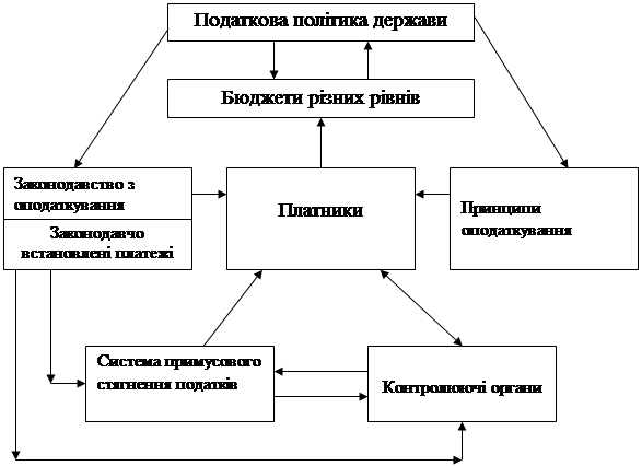 Аналiзуючи систему оподаткування, потрібно звернутись спочатку до базового Закону України «Про систему оподаткування». В ньому дається таке визначення системи оподаткування (вживається також термiн «податкова система»): «сукупнiсть податків i зборiв (обов’язкових влатежiв) до бюджетiв та до державних цільових фондiв, що справляються у встановленому законами України порядку, становить систему оподаткування».