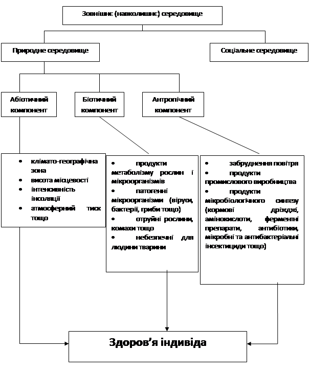 Екологічні аспекти здоров'я визначаються характером дії абіотичних, біотичних і комплексу антропічних чинників навколишнього середовища на організм людини (див. схему № 8).