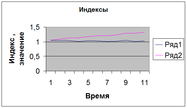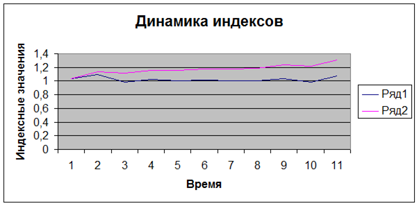 На графике видно , что изменение как цепных , так и базисных индексов протекает плавно , без резких скачков.
