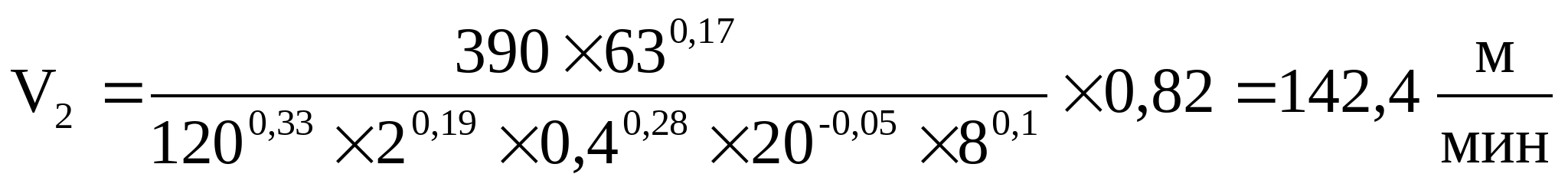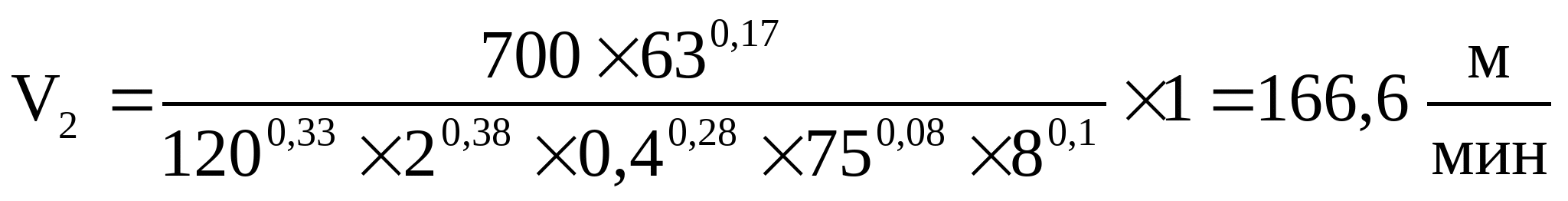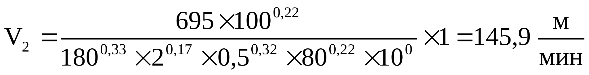 Для второго режима резания при ширине заготовки = 80 мм выбираем торцевую фрезу из твердого сплава ВК6 диаметром D = 100 мм, числом зубьев Z = 10 и периодом стойкости T = 180 мин. Скорость резания вычисляем по формуле (1.1), приняв по [1] = 695; m = 0,33; x = 0,17; y = 0,32; u = 0,22; p = 0; q = 0,22: