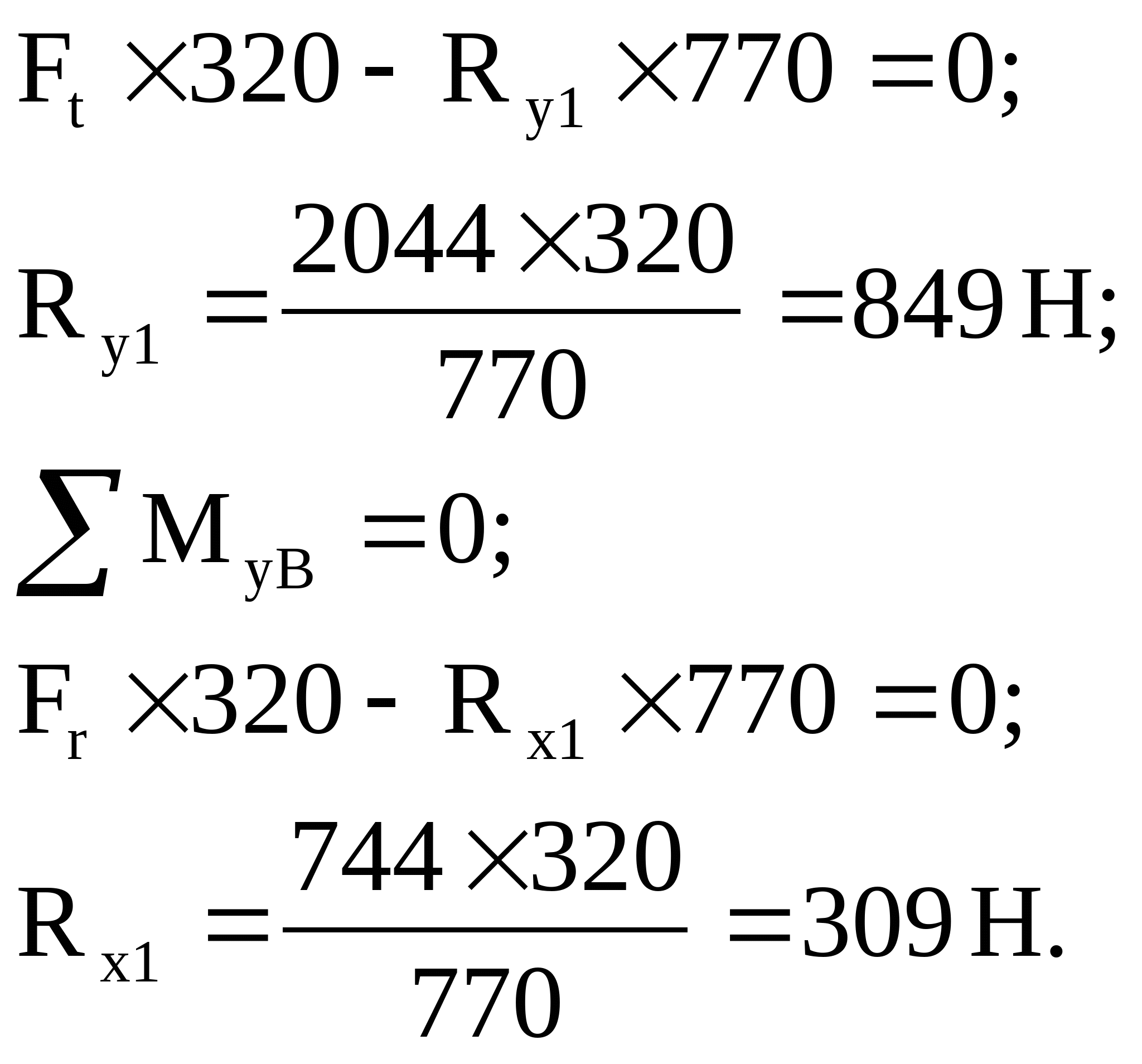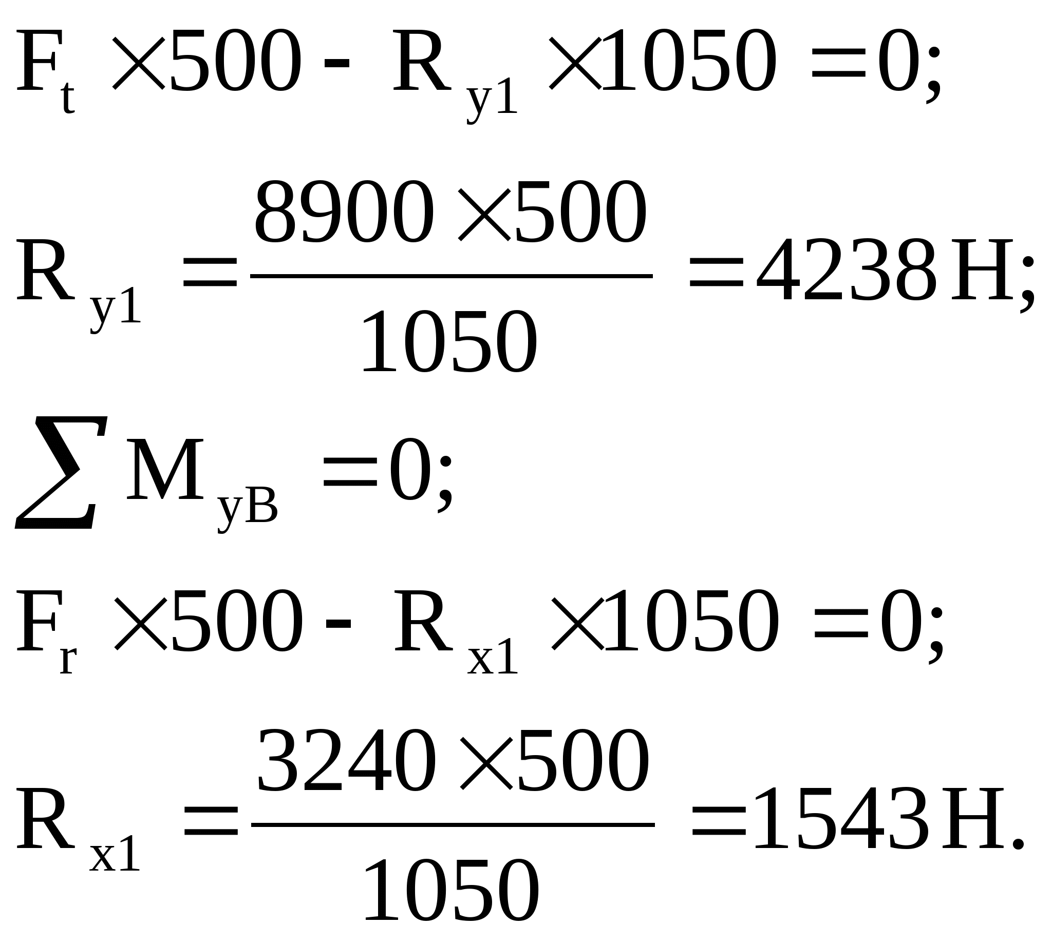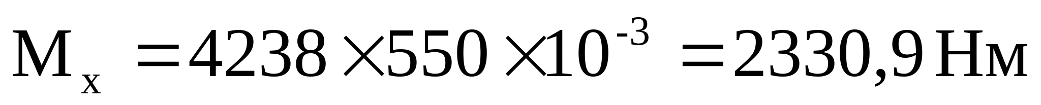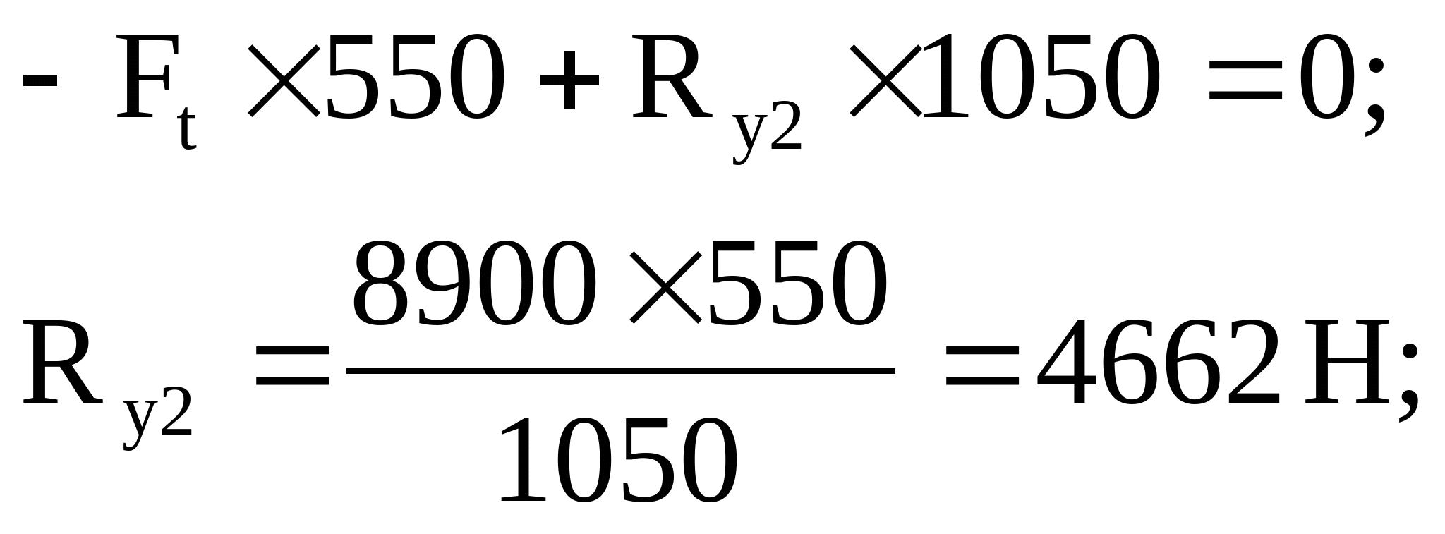 По полученным данным строим эпюры моментов, которые представлены на рисунке 4 .         Rx1 A B Rx2      Ry1 Ft Ry2       a = 550 Fr b = 500                                               My, Нм                  848,65 Mx, Нм      2330,9 Рисунок 4- Эпюры моментов