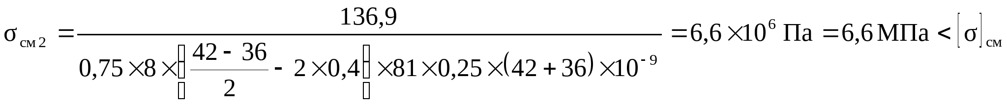 На втором валу для зубчатых колес 2, 4, 6 назначаем призматические шпонки 10Ч8Ч32 по ГОСТ 23360-78 . Проверку соединения на смятие производим по формуле (6.1):