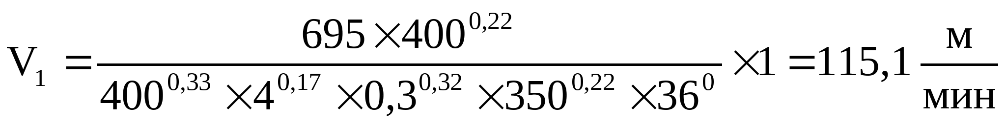 Для первого режима резания при ширине заготовки = 350 мм выбираем торцевую фрезу из твердого сплава ВК6 диаметром D = 400 мм, числом зубьев Z = 36 и периодом стойкости T = 400 мин. Скорость резания вычисляем по формуле (1.1), приняв по [1] = 695; m = 0,33; x = 0,17; y = 0,32; u = 0,22; p = 0; q = 0,22: .