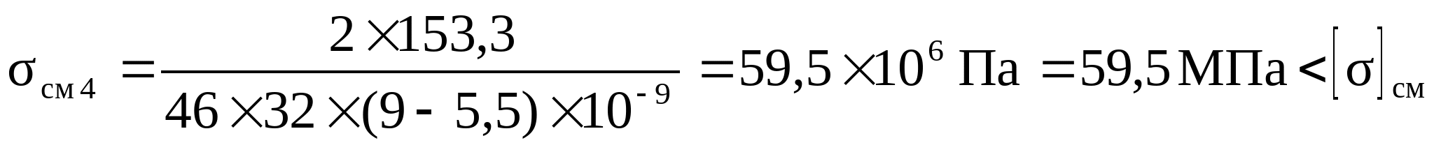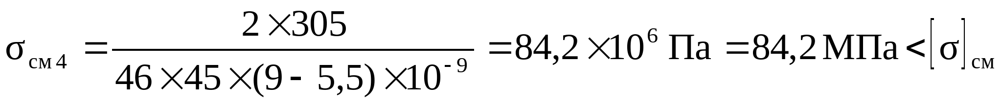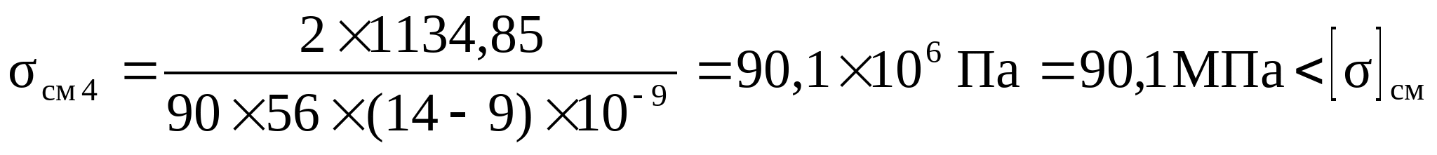 На четвертом валу для зубчатых колес 16, 18 назначаем призматические шпонки 14Ч9Ч45 по ГОСТ 23360-78 . Проверку соединения на смятие производим по формуле (6.1):