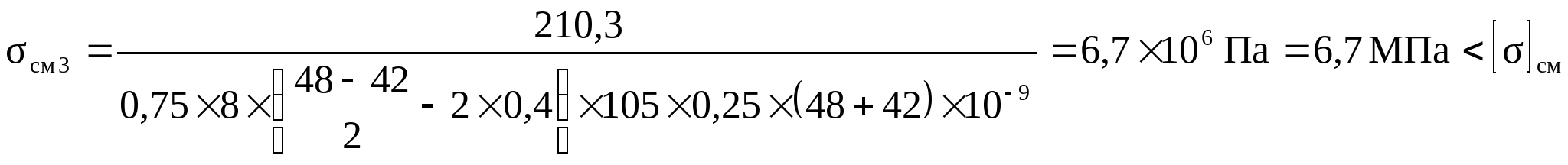 На третьем валу для зубчатых колес 6, 8, 10, назначаем призматические шпонки 18Ч11Ч40 по ГОСТ 23360-78 . Проверку соединения на смятие производим по формуле (6.1):