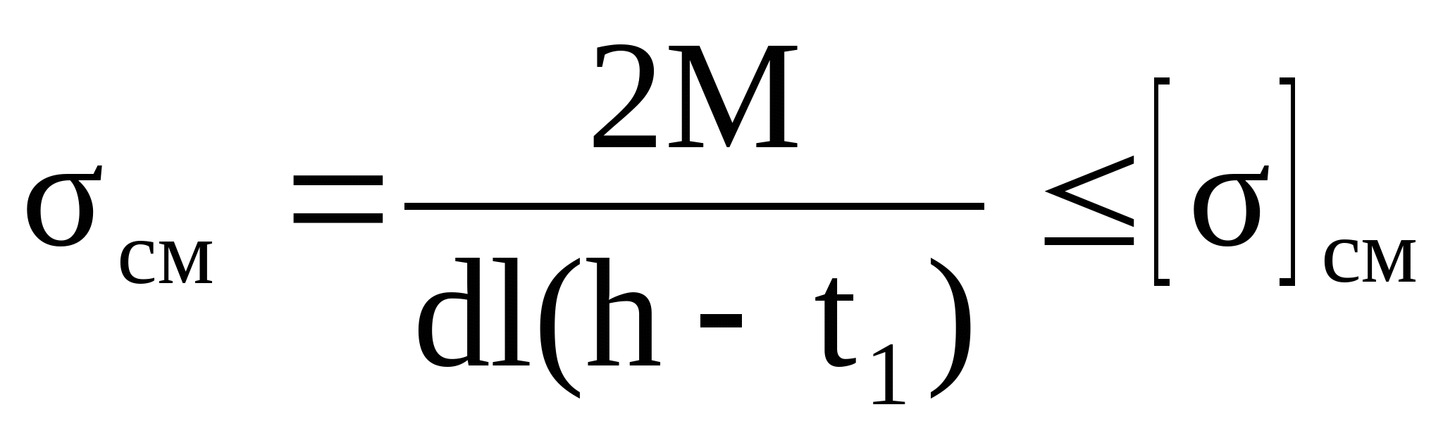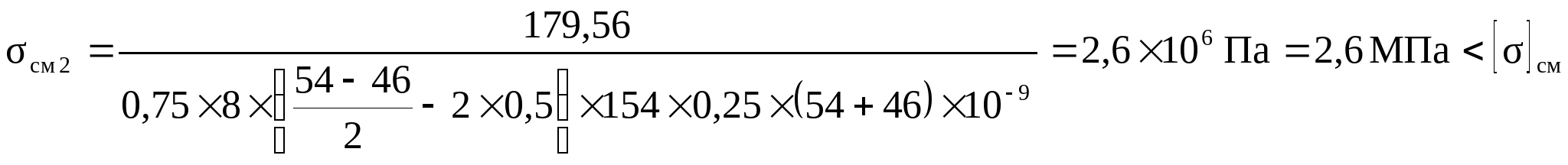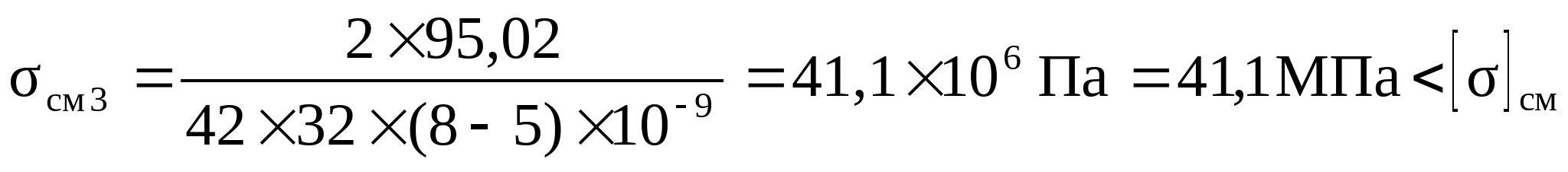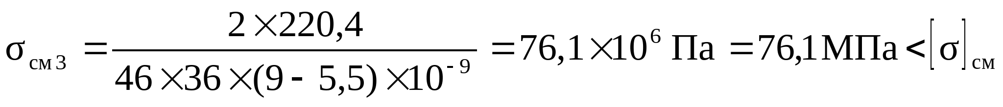 где - диаметр в месте посадки шпонки, мм; - передаваемый крутящий момент, Нм; - рабочая длинна шпонки, мм; - площадь смятия, мм2; - высота шпонки, мм; - глубина паза вала, мм; МПа – допускаемое напряжение смятия.