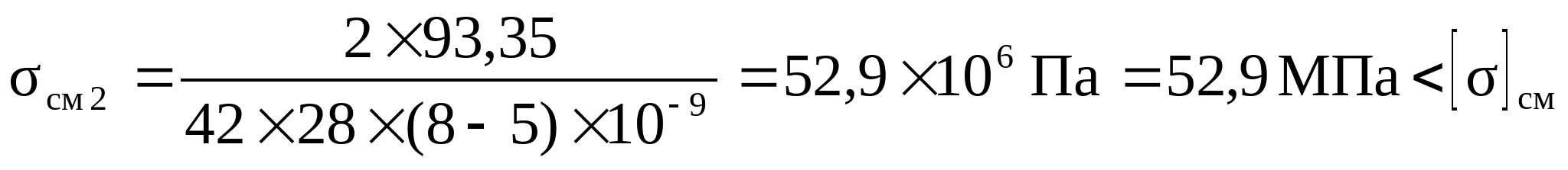 На втором валу для зубчатых колес 2, 4 назначаем призматические шпонки 10Ч8Ч28 по ГОСТ 23360-78 . Проверку соединения на смятие производим по формуле (6.1):