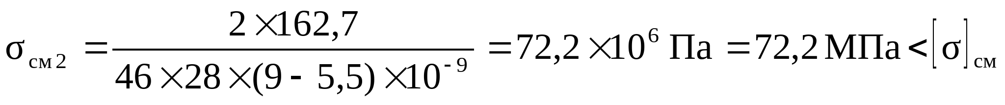 На втором валу для зубчатых колес 2, 4 назначаем призматические шпонки 14Ч9Ч28 по ГОСТ 23360-78 . Проверку соединения на смятие производим по формуле (6.1):