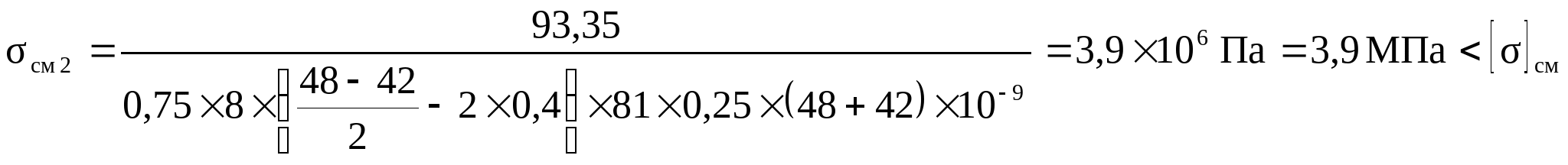 На первом валу для подвижного блока колес назначаем шлицевое прямобочное соединение средней серии с числом шлицев Z = 8, наружным диаметром D = 42 мм, шириной шлицев b = 7 мм, и величиной фаски f = 0,4 мм по ГОСТ 1139-80 .Проверку шлицевого соединения производим по формуле (6.3) :  На втором валу для подвижного блока колес назначаем шлицевое прямобочное соединение средней серии с числом шлицев Z = 8, наружным диаметром D = 42 мм, шириной шлицев b = 7 мм, и величиной фаски f = 0,4 мм по ГОСТ 1139-80 .Проверку шлицевого соединения производим по формуле (6.3) :