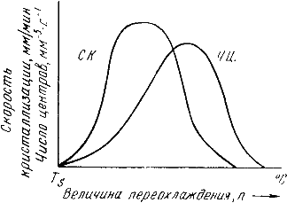 В свою очередь, число центров кристаллизации (ч.ц.) и скорость роста кристаллов (с.р.) зависят от степени переохлаждения (рис. 3.6).
