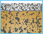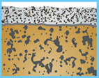 Впервые нанесение на сталебронзовые вкладыши покрытия алюминия с оловом применила фирма Glyco (в настоящее время Federal Mogul, Wiesbaden) Германия. Микроструктура слоя покрытия, названного фирмой “Sputter”, и, характеризуемая равномерным распределением частиц олова в алюминии, представлена на рис. 1а. Для улучшения адгезии такого покрытия с бронзой, оно наносится через подслой сплава никеля с хромом. Для получения покрытия аналогичного состава и свойств, Австрийская фирма Miba разработала свою технологию его получения на основе того же физического метода PVD. Типичный образец микроструктуры такого покрытия, с равномерным распределением оловянных частиц в виде более крупных дендридов в алюминии представлен на рис.1в. Покрытие выдерживает удельные нагрузки превышающие 100 МПа и значительно увеличивает ресурс подшипника. Однако высокая твердость сплава (HV 90-110) ухудшает антифрикционные свойства подшипника и делает его более чувствительным к различным нарушениям при изготовлении, ремонте и эксплуатации. Фирма «Технокомплекс» разработала технологию вакуумного ионно-плазменного напыления (PVD-ТК) для нанесения на бронзовый слой комплексного покрытия алюминий-олово с переменным содержанием олова. В таком покрытии основной слой соответствует сплаву алюминия с 20% олова, а к поверхности содержание олова увеличивается для улучшения антифрикционных свойств, прирабатываемости, способности к запрессовке посторонних частиц и т.д. Это позволяет устранить вышеупомянутые противоречия между прочностью и антифрикционными качествами покрытий вкладышей и создать подшипник нового типа, способный работать в двигателях практически всех типов. Кроме того, комбинации и сочетания материалов в слое могут быть различными для обеспечения наилучших показателей надежности и ресурса работы конкретных двигателей. Микроструктура такого покрытия приведена на рис. 1с. Важным положительным качеством процесса вакуумного ионно-плазменного напыления также является его экологическая безопасность в сравнении с гальваническим процессом.
