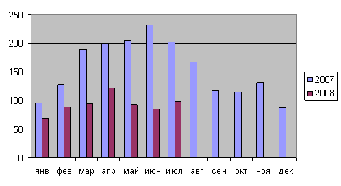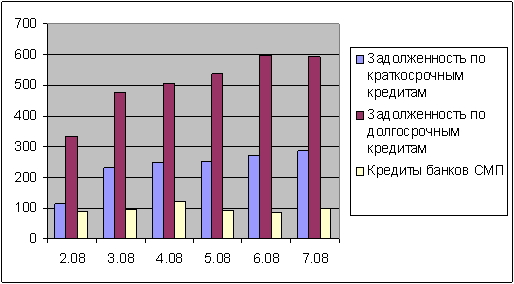 В начале 2008 года по данным национального банка РК наблюдается рост кредитов субъектам малого предпринимательства, а в мае наблюдается снижение объема кредитов (см. рис. 2).